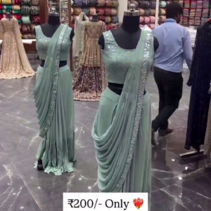 Designer Saree Style Gown with Sequin Blouse ? Mint Green