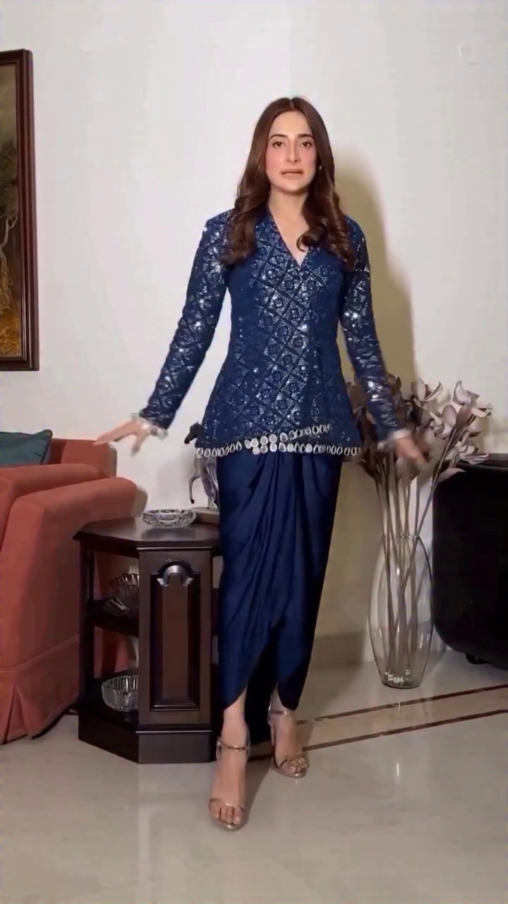 An assymetrical jacket with all over sequins work in geometric pattern, with mirror droplets on the hem and cuffs. Paired with a beautiful satin dhoti skirt!