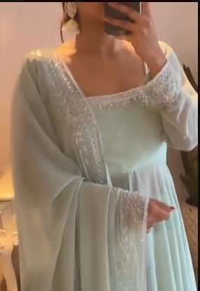 To complete the ensemble, the set includes a matching dupatta, which adds an extra layer of elegance and sophistication. The dupatta is typically made of the same faux georgette fabric, creating a cohesive look. It may be adorned with intricate embroidery, lace, or sequins, elevating the overall charm of the outfit.