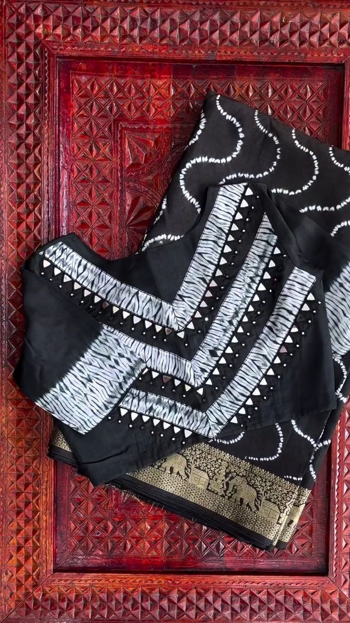 Narrated by the existence of diverse and eye-catching patterns that contrast against the mysterious shade of black in this saree, while embodying harmony, this saree tends to add wings to her personality.
