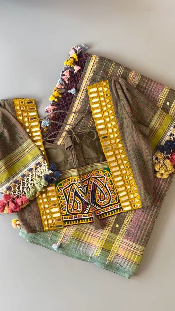 Combo: yes, Bhujodi handloom kala cotton saree and Kutch embroidery with mirror work stitched blouse (ready-to-wear)
