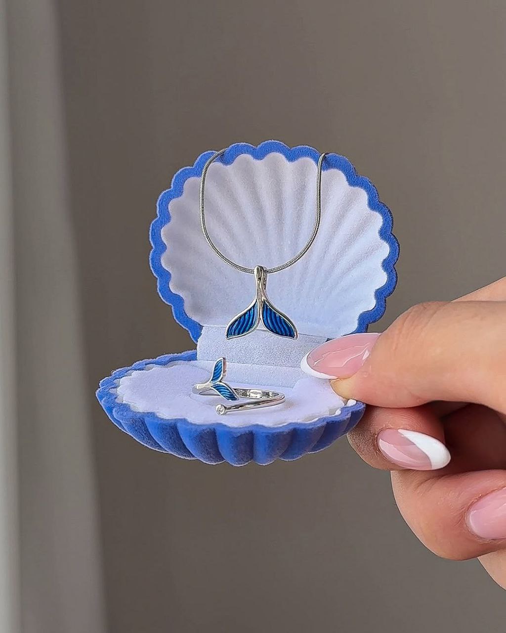 Inspired by ocean beauty, this mermaid tail jewelry set captures a graceful and whimsical aesthetic. The necklace showcases a delicately shaped tail pendant with deep blue enamel accents, suspended from a smooth, minimalist chain. The matching ring mirrors the same tail design and offers an adjustable fit for everyday comfort. Perfect for ocean lovers or those drawn to unique, symbolic jewelry, this set adds a subtle statement to casual outfits while remaining refined enough for special occasions.