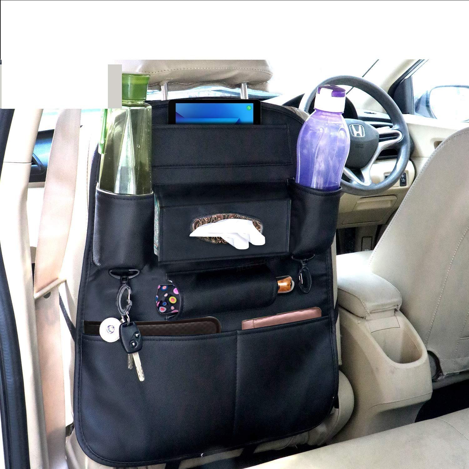 A practical car back seat organizer designed to keep your vehicle neat and clutter-free. Featuring multiple storage pockets, bottle holders, and a tablet slot, it helps organize daily travel essentials such as water bottles, tissues, gadgets, wallets, and keys. Easy to install on most car seats.