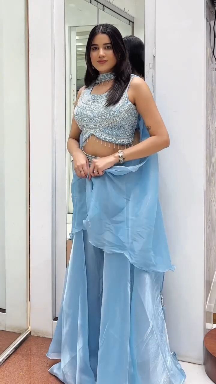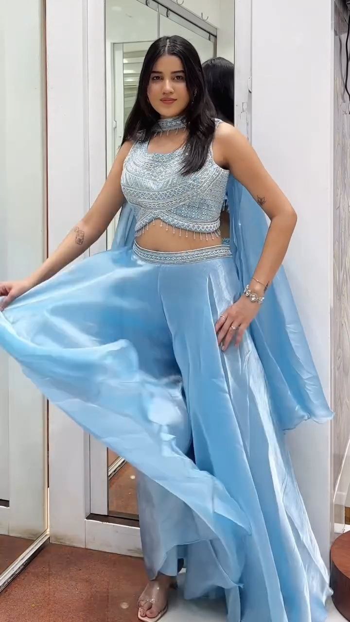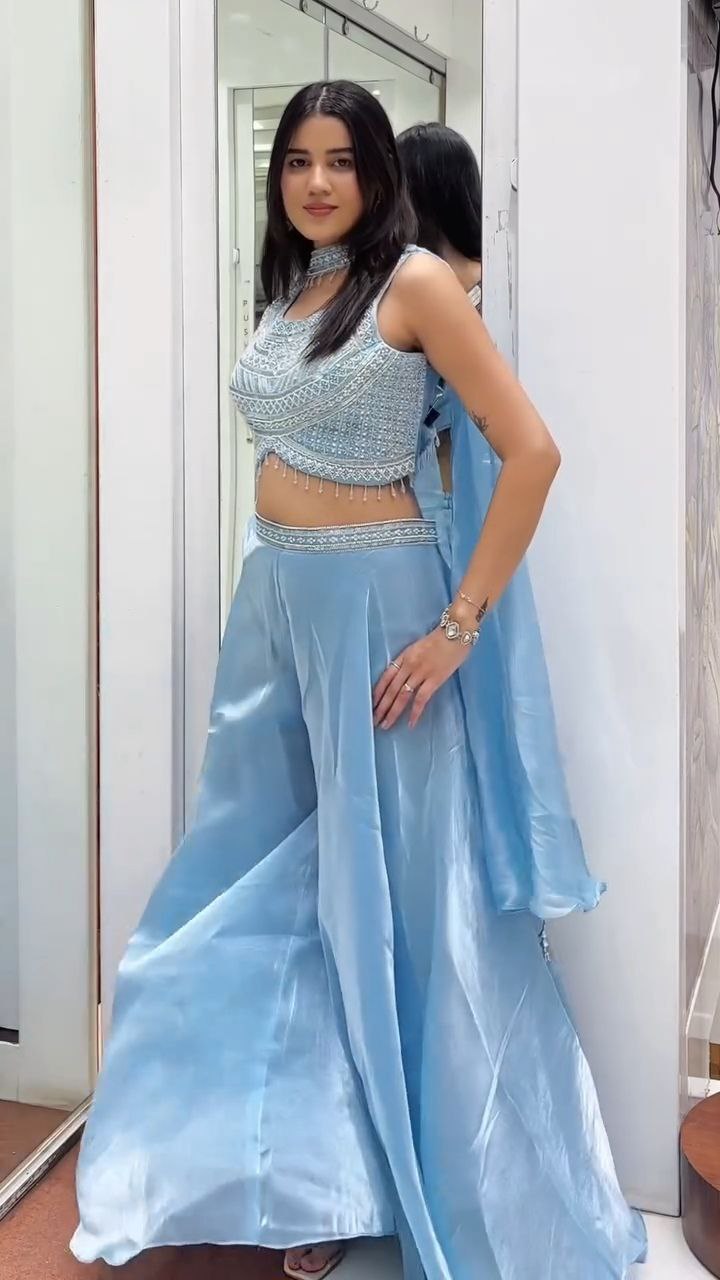 This ice blue crop top palazzo set blends contemporary silhouette with traditional craftsmanship. The sleeveless crop top is adorned with fine embroidery and delicate bead accents, adding a refined shimmer. The high-waisted palazzo pants feature a smooth satin finish with a fluid drape that enhances movement and comfort. Completing the look is a lightweight net dupatta that adds softness and elegance. Perfect for festive evenings and special occasions, this ensemble offers a sophisticated yet modern ethnic appeal.