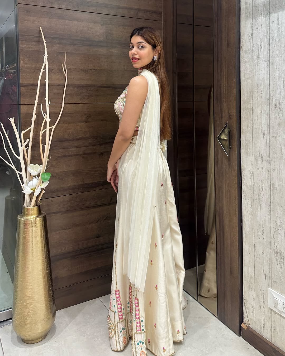 Elevate your festive look with this captivating ivory sharara set that blends tradition with modern glam. The heavily embellished bustier blouse features multi-color threadwork, mirror highlights, and delicate pearl danglings, finished with a matching embroidered neckband. Paired with flared ivory sharara pants adorned with intricate mirror and sequin embroidery at the hem, this outfit is perfect for haldi, mehndi, or festive celebrations where style makes a statement.