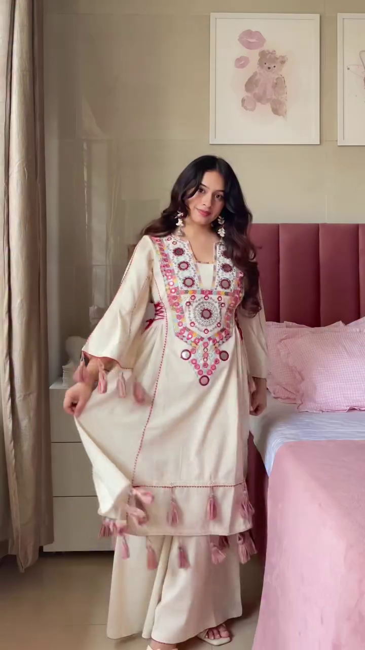 Turn heads with this stunning one-shoulder satin co-ord set in a rich purple hue. Adorned with delicate vertical sequin embroidery, this outfit is perfect for modern festive vibes. The flowy palazzo pants offer elegance with comfort, while the asymmetrical neckline brings a stylish twist.