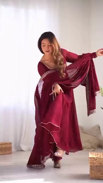 Maroon Heavy Georgette Anarkali Suit Set with Mirror Border Dupatta