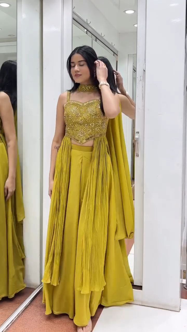 This mustard yellow embroidered palazzo set is designed for women who love bold yet graceful ethnic fashion. The intricately embellished crop top creates a rich focal point, while the wide palazzo pants ensure comfort and elegance. The pleated cape-style dupatta adds a modern designer touch, making this outfit perfect for festive evenings and wedding celebrations. A flawless blend of tradition and contemporary style, this set is ideal for standout occasion wear.