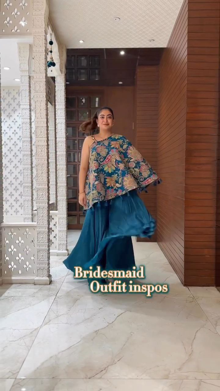 A vibrant festive co-ord set featuring an embroidered short kurti paired with flowy sharara pants, designed for modern ethnic elegance.