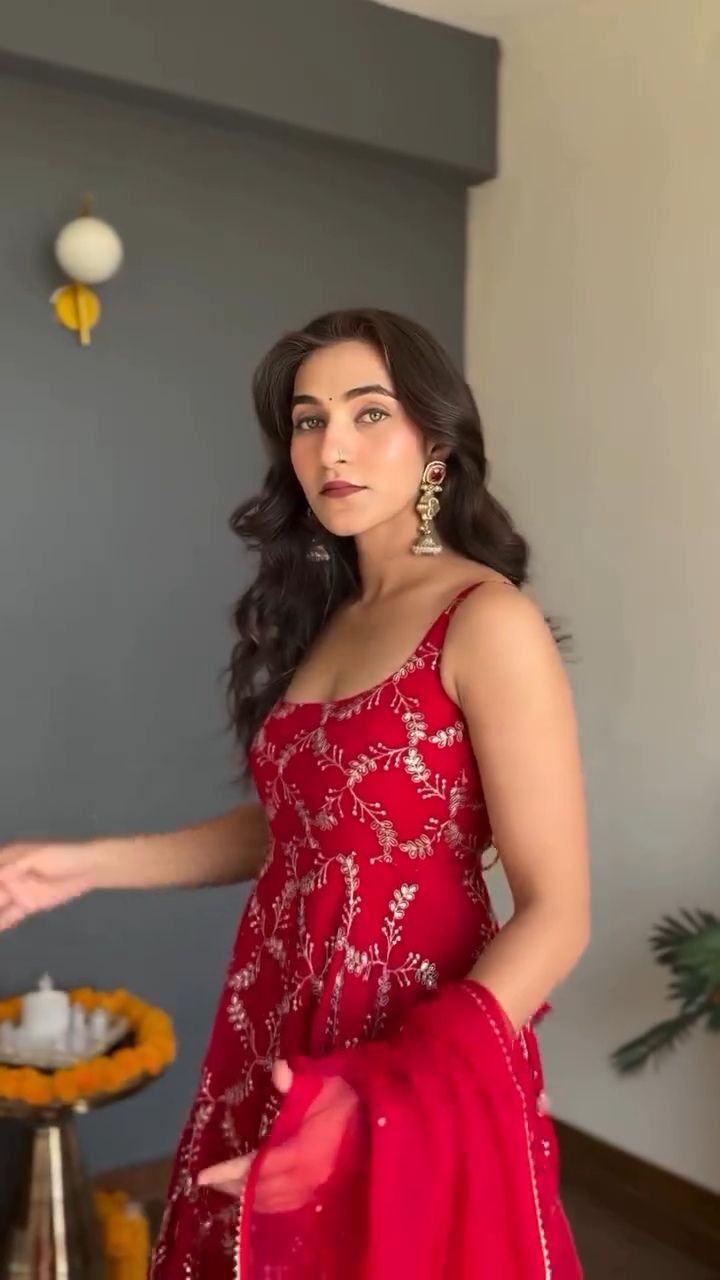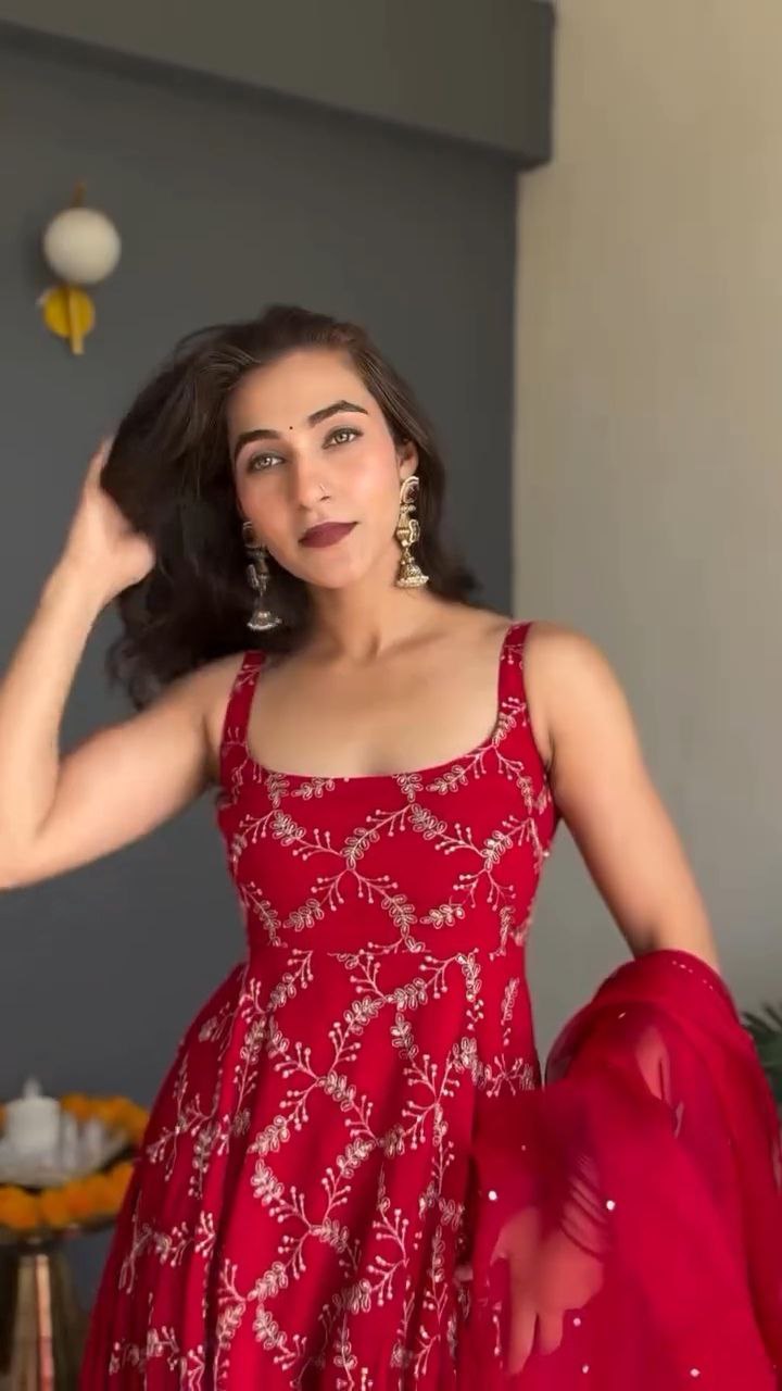 This Scarlet Red Embroidered Georgette Anarkali Set is the perfect blend of elegance and celebration. The Anarkali features intricate thread embroidery with sequin detailing that adds a graceful shimmer to its rich hue. The soft organza dupatta, adorned with matching embroidery and delicate sequin highlights, completes the look with sophistication.