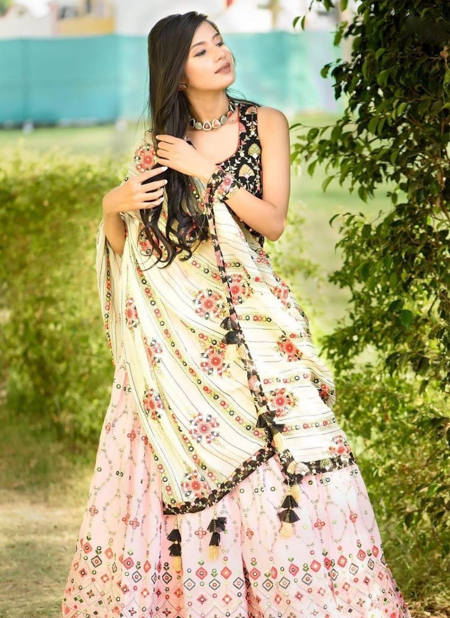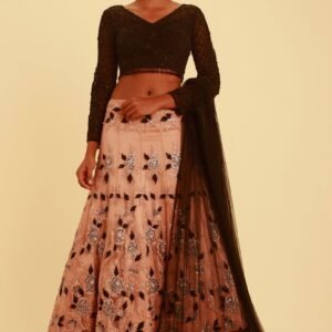 NUDE PINK LEHENGA WITH FLORAL DETAILS AND CONTRAST BLACK TASSELED CHOLI